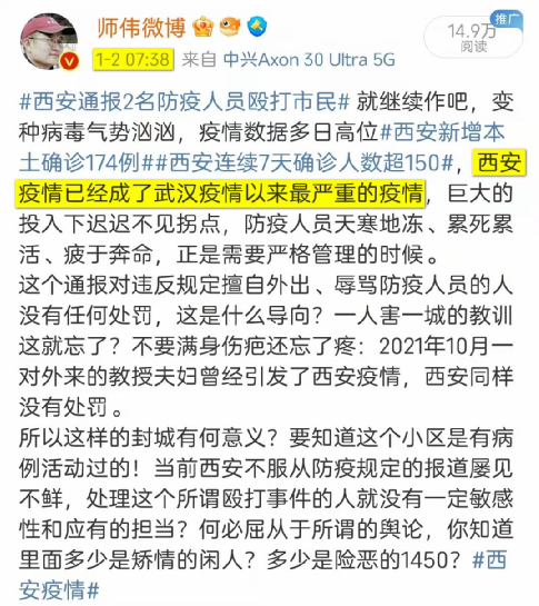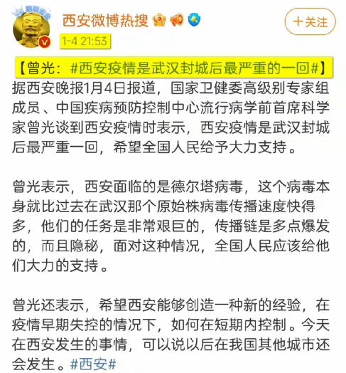 西安疫情已经成了武汉疫情之后最严重的疫情,2022年1月2日我就这么说,两天后曾光也这么说——既然如此,比较一下两个城市的疫情是一件有意义的事情。1、武汉是九省通衢、西安是一带一路重镇,春节前在这里出事影响巨大,谁最高兴?正经人都知道!2、武汉毒源是华南市场、西安毒源是机场,都是外来输入,武汉西安是受害者、中国是受害者;捣乱的是美国、除非他们开放德特里克堡而且自证了清白;4、武汉封城迟钝、西安封城敏捷,这是防疫经验积累的结果;5、武汉物资紧缺、西安改善很多,这是防疫能力增加的体现;6、西安死亡少、重症也少,这依然是防疫能力的证明;7、武汉搞得人心惶惶、西安总体气定神闲,因为疫情极大地提高中国人的自信心;8、武汉起初抗拒中医、西安一开始就上中医,武汉证明中医明显有效、西安继续证明中医明显有效;9、武汉没有疫苗、西安有疫苗,西安因为九成人打了疫苗、无法组织对照组,所以疫苗的作用无结论;10、武汉市民因为恐慌涌入医院导致的交叉感染在2020年2月下旬占了全部病例的四成,西安无此问题。武汉的恐慌来自哨子和日记等因素,所以我们必须明确反对哨子和日记——日记不用再说,哨子是敌人的话术,意思是体制失效、个人被迫违规来反抗,暗指中国瞒报!11、武汉疫情期有矫情的贱人、西安也有,这是我们的教育和宣传需要反思的;12、武汉鼓吹瑞德西韦是特效药、西安则少了很多类似声音,洋奴不好骗人了;13、武汉有大别墅老记女写了六十天日记妖言惑众、余毒甚广,西安有姓江的写了十天日记、结果一出来就被揭穿;14、武汉有方便面趁火打劫、西安则无类似幺蛾子,因为方便面已经信誉破产;15、武汉有敌人网军写小作文骗人、西安照样有,西安打击力度稍大但还是很不到位,因为每天依然有小作文不断出现;16、武汉还没出现与病毒共存的瞎扯,西安已经看穿了与病毒共存的谬论;17、武汉还没有健康码因此管理难度大,西安有了健康码但崩了两次——有迹象表明西安崩是因为服务器被攻击。你猜是谁攻击的?这可是个送分题!18、武汉上下团结一致、各省纷纷出力、全国医护和解放军驰援,西安也是如此;19、武汉文宣一塌糊涂、西安文宣一塌糊涂。他们的表现配不上这个国家!最后劳驾批评西安的人现在稍稍收手,多鼓励、少批评,抗疫如战争,紧要关头不要添乱,要追责等机会合适了再说。其实放眼世界,西安已经做得很好了——扪心自问,西安是千万人口的大城市,你来干就一定比现在干得好?甚至湖北和武汉被干掉的F4放在别的国家妥妥是优秀干部。有些人不要身在福中不知福,美国死亡已经超80万,按人口折算到中国约340万,而实际上我们是不到0.6万。你要是不想当那340万中的一员,就积极配合防疫要求,甚至可以出力当志愿者。不管怎样,千万不要违规出小区去买馒头,千万不要自己马大哈没带卫生巾就打了一天的12345撒泼,更不要为了一点可怜的打赏昧着良心不删谣文。补充一点,造谣西安的宋汶洮已经被撤职了,这完全是咎由自取。同时鉴于其已经触犯刑法,我希望他早日获刑——是的,防疫就是生物战,必须要严峻法度,对恶行的仁慈就是对自己的犯罪。这一点从武汉到西安不知被验证了多少次了!(作者:师伟)